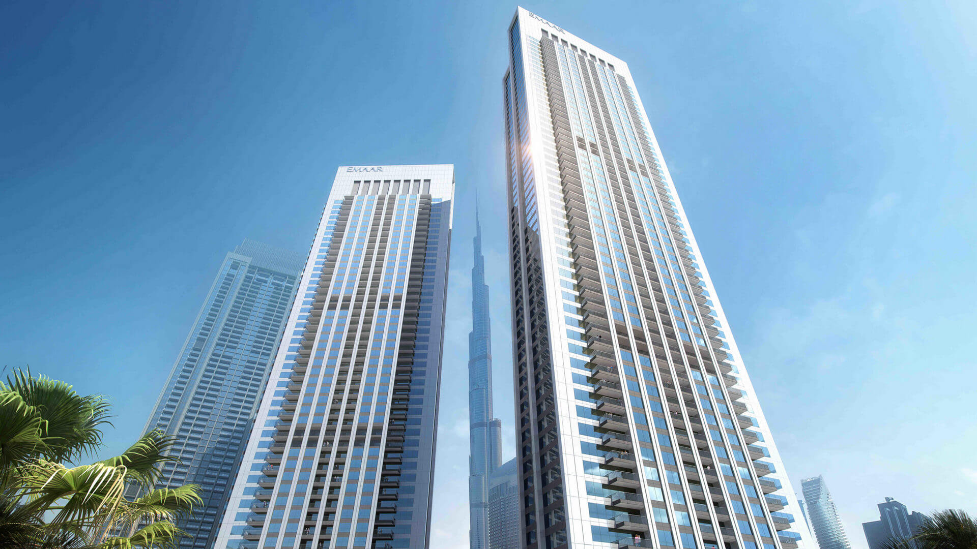 The skyscrapers are designed in a modern architectural style, as can be seen from exterior details, such as a monochrome colour palette, slightly asymmetrical sloping roofs, and a glass facade that effectively reflects the sun’s rays during the day and emits its own light at night. Thanks to this exterior, the complex harmoniously fits into the overall picture of the fashionable area of Downtown Dubai, known for its New York-style setting. The development’s majestic lobby resembles a shopping centre thanks to the showcases of numerous commercial areas, escalators, glass railings, marble floors, and elegant decorations. The interiors of the residential properties include soft colours, minimalist furniture, and a well-thought-out lighting system that provides the most comfortable environment.