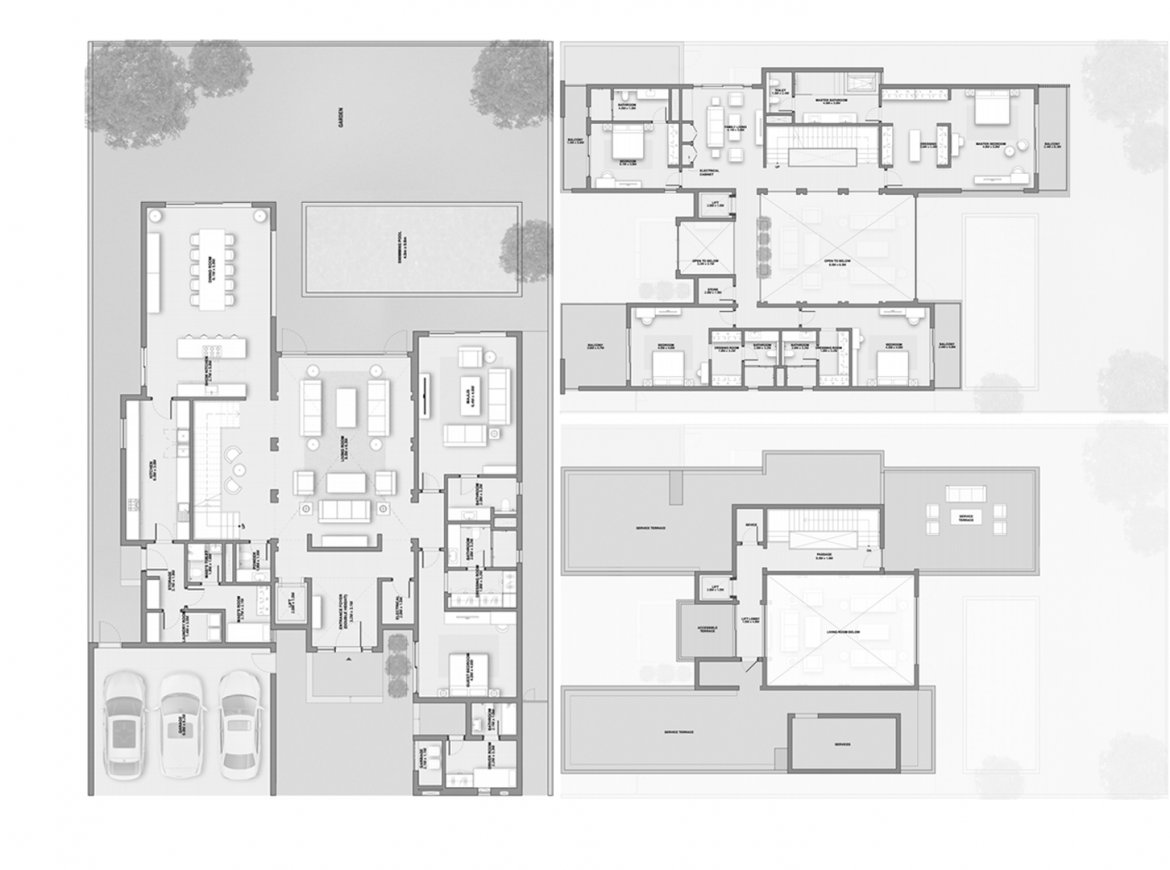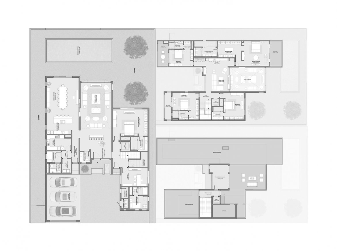 - Тип B. Площадь этих объектов составляет 788,82 м2. На первом этаже располагаются закрытая и открытая кухни, столовая, гостиная, комната для прислуги с примыкающей ванной, отдельный вход для персонала, подсобка, прихожая, уборная, гостевая спальня с ванной, кабинет, комната для водителя с ванной и гараж. Второй этаж занимают 4 спальни с гардеробными, ванными и балконами, кладовая комната для продуктов и семейная комната.